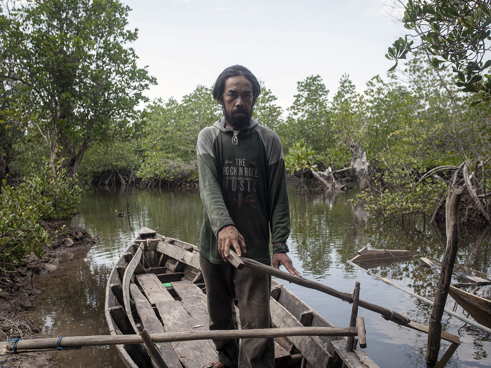 “Kalau air surut kita cari [kepiting], kalau pasang tak bisa. Kita cari di lubang-lubang, jepit pakai kayu,” kata Lamat. “Bapak saya dulu cari kepiting. Dapat satu atau dua ekor jual atau tukar makan. Kadang dapat, kadang tidak.”