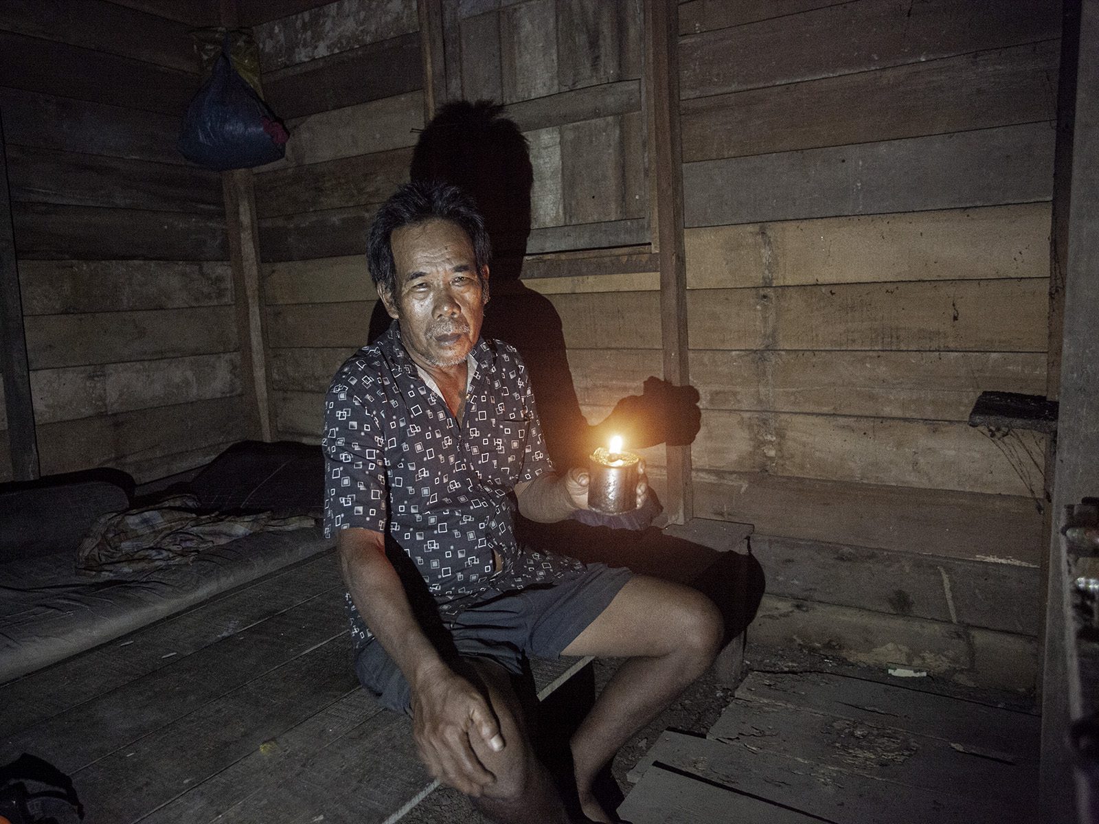 Lamat, salah satu dari delapan orang asli Suku Orang Darat di Kampung Sungai Sadap, Pulau Rempang, Batam, Kepulauan Riau, memegang pelita di dalam kamar tidurnya. (Project M/Andaru KZ – CC BY-NC-ND 4.0)