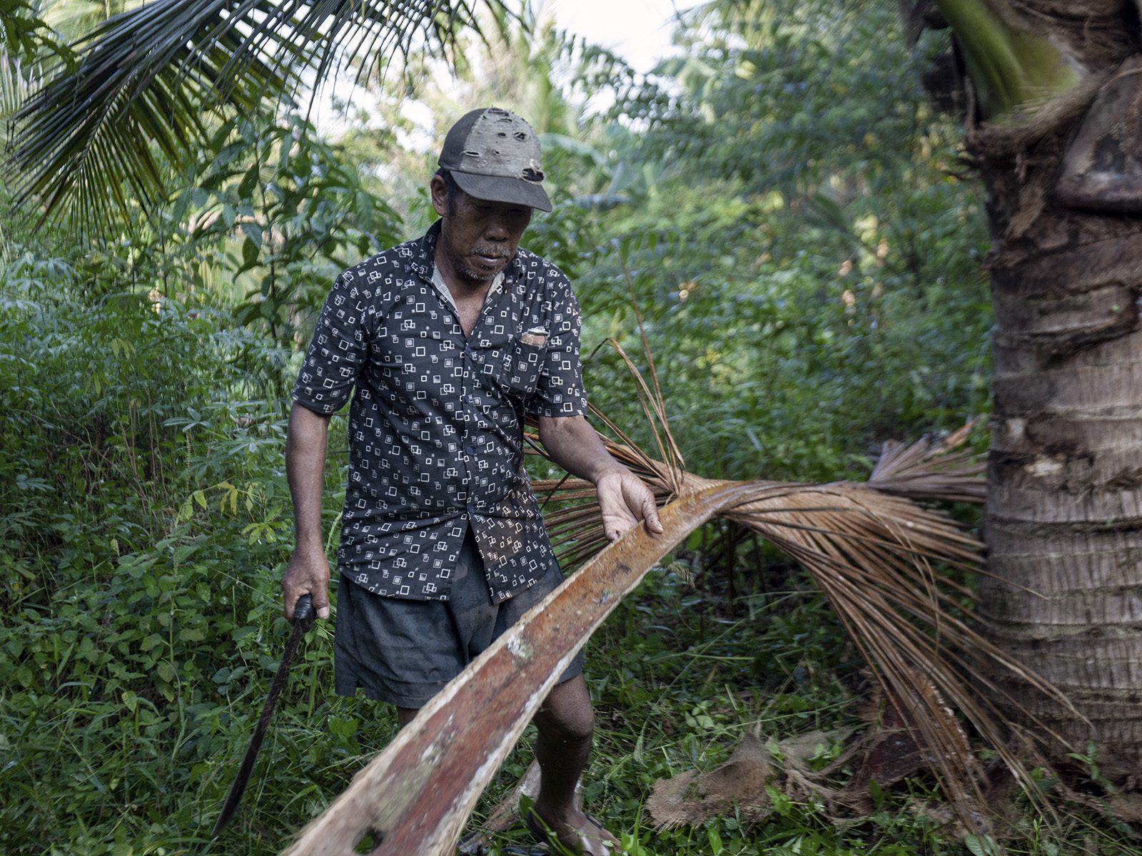“Sehari bisa nebas 30 batang pohon kelapa kalau tak hujan. Kalau hujan paling 15 pohon,” katanya.
