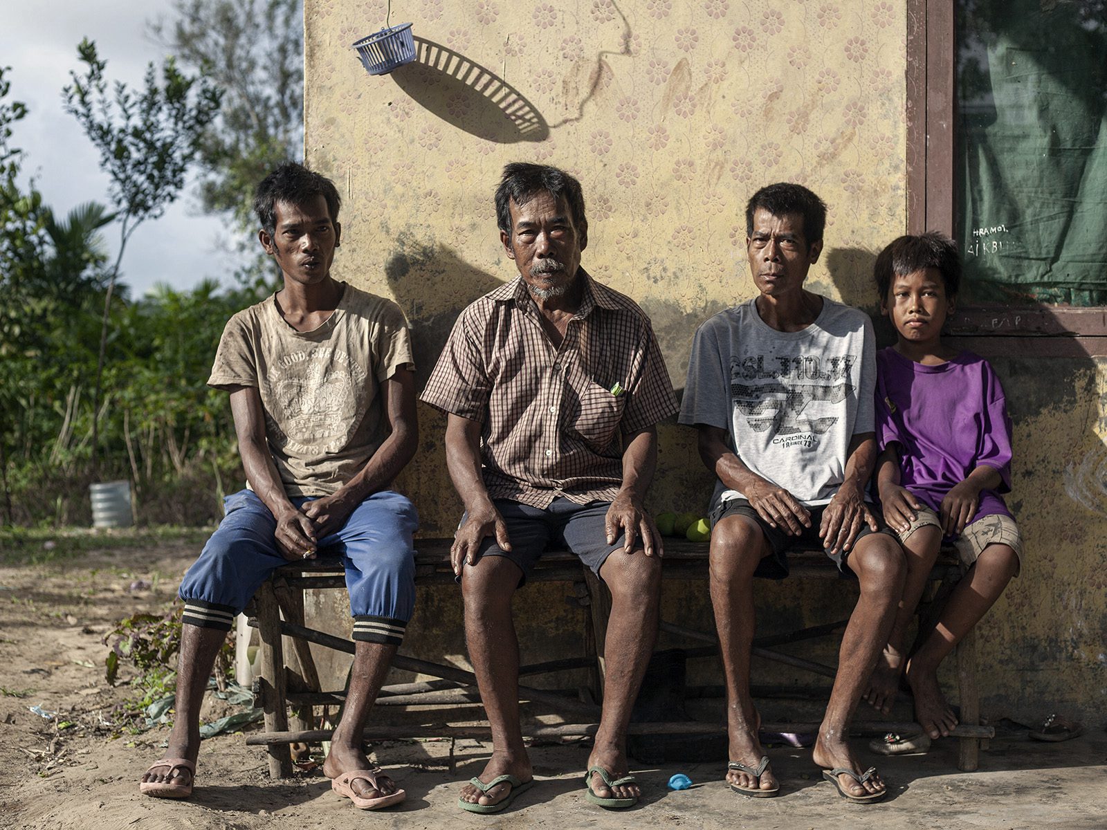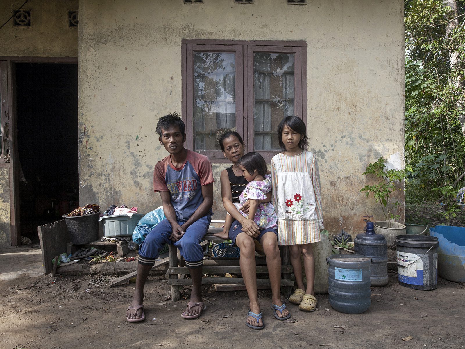 Tongku (kiri), salah satu dari delapan orang asli Suku Orang Darat di Kampung Sungai Sadap, Pulau Rempang, Batam, Kepulauan Riau duduk bersama istri dan anak-anaknya di depan rumah bantuan pemerintah. (Project M/Andaru KZ – CC BY-NC-ND 4.0)