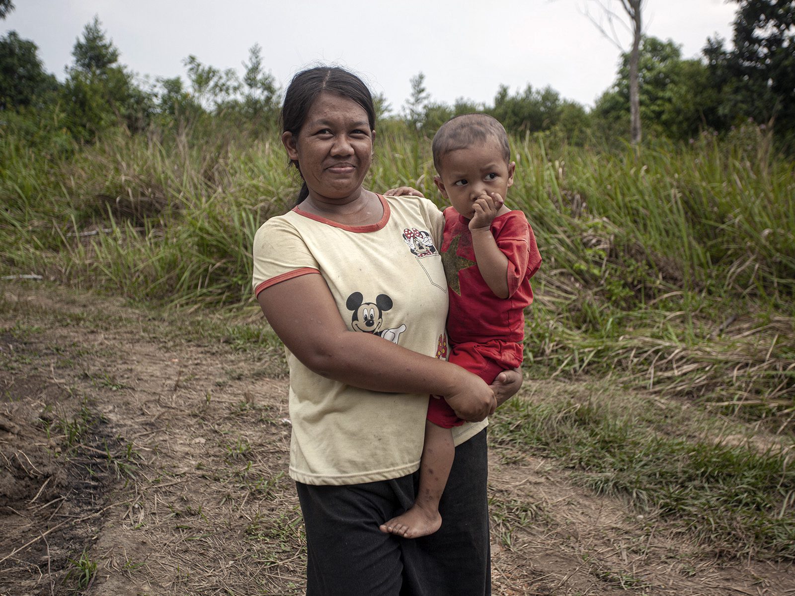 Umiyati, salah satu dari delapan orang asli Suku Orang Darat di Kampung Sungai Sadap, Pulau Rempang, Batam, Kepulauan Riau menggendong anaknya. (Project M/Andaru KZ – CC BY-NC-ND 4.0)