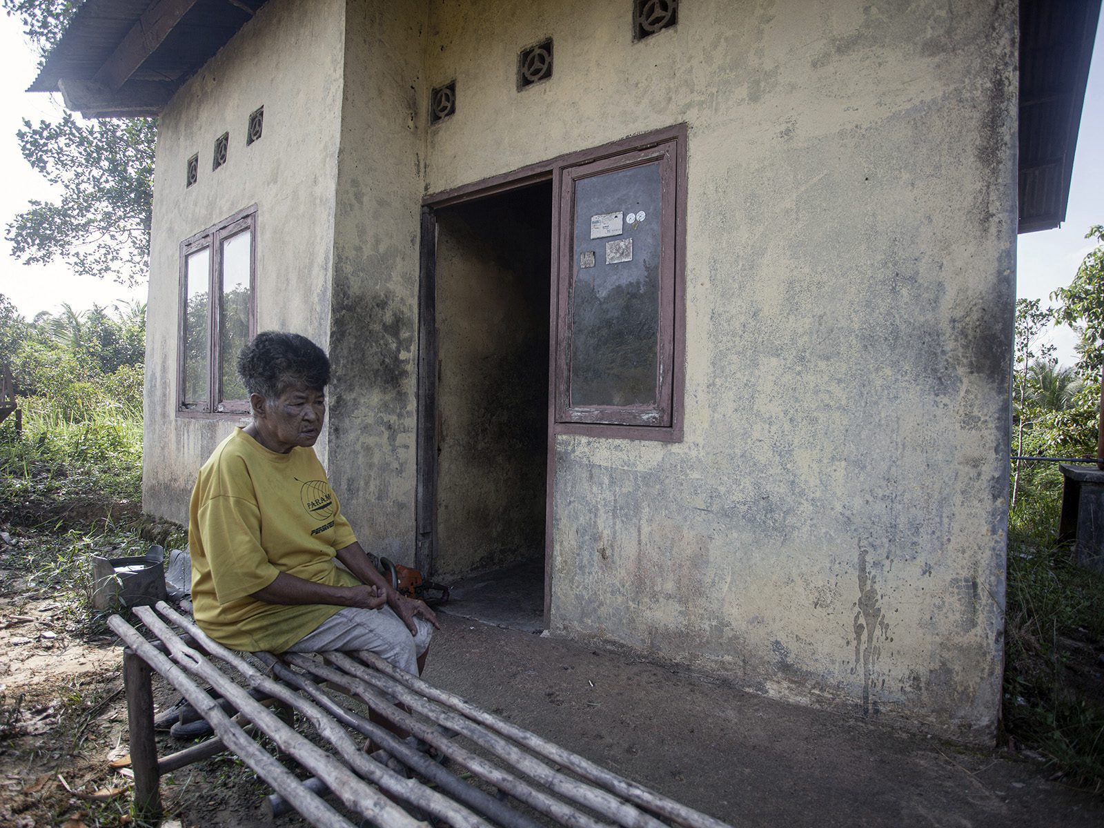 Rosnah, perempuan keturunan Suku Orang Darat, duduk di depan rumah bantuan dari pemerintah di Kampung Sungai Sadap, Pulau Rempang, Batam, Kepulauan Riau. (Project M/Andaru KZ – CC BY-NC-ND 4.0)