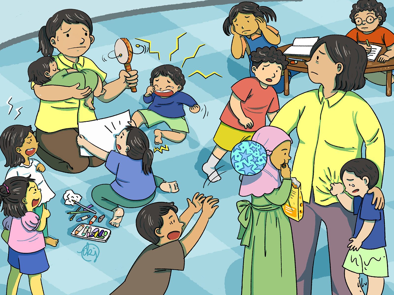 Belum lagi bila ada anak yang sedang memasuki fase tantrum. Guru biasanya hanya bisa menenangkan mereka di ruang kepala sekolah yang berada di sebelah dan masih dapat dilihat anak-anak melalui celah kaca.