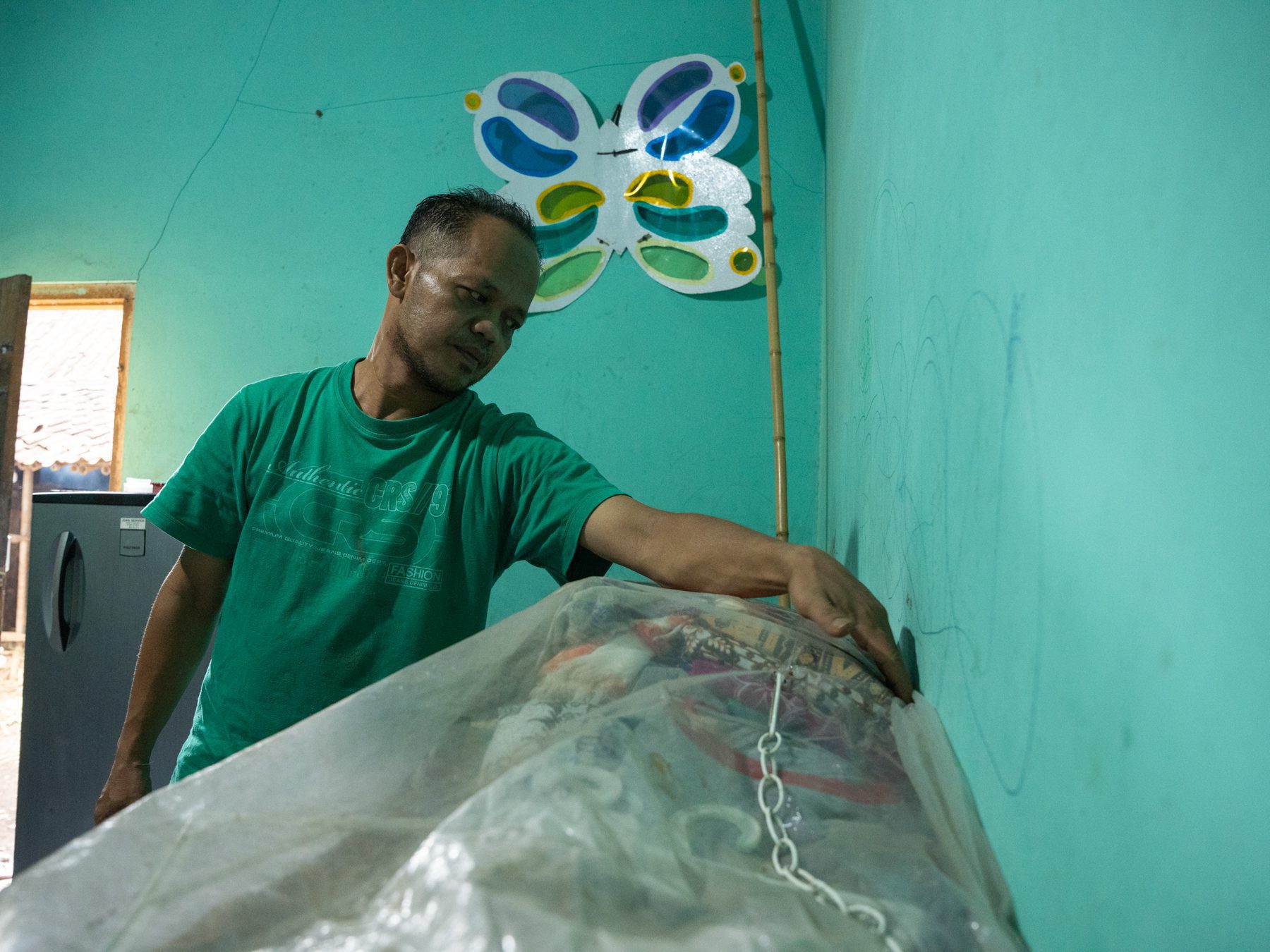 TUMPUKAN karung putih berada di pojokan kamar. Isinya adalah baju dagangan ikon Borobudur milik Hindarti yang dititipkan di rumah tetangga. Sebelum menganggur, bersama kelompok pedagang Sentra Kerajinan dan Makanan Borobudur (SKMB) yang mayoritas perempuan, Hindarti sempat berjualan di trotoar jalan Pintu 6 sisi utara candi.