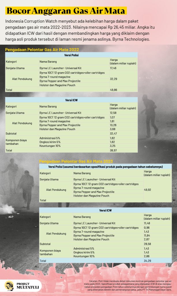 Tim Klub Jurnalis Investigasi (KJI) menemukan sejumlah kejanggalan dalam paket pengadaan pelontar gas air mata Polri. Temuan ini memperkuat laporan ICW terkait dugaan korupsi pengadaan gas air mata pada 2022-2023. Ada dugaan kongkalikong dan penggelembungan harga Rp26,45 miliar.
