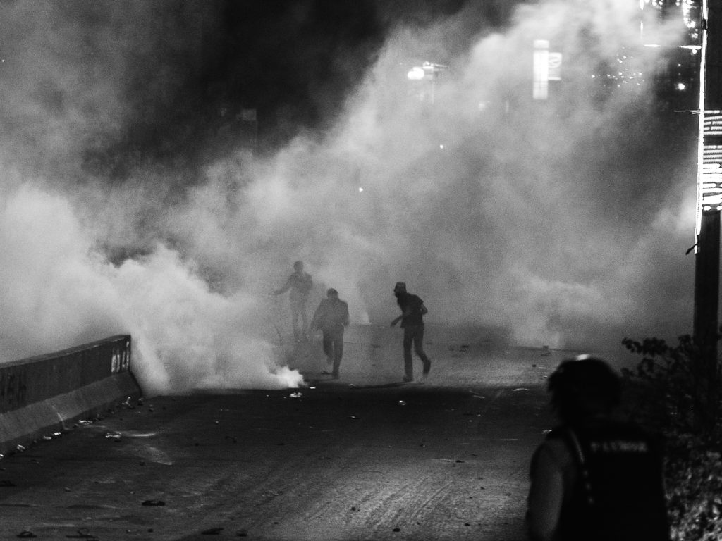 Polisi menembakkan gas air mata ke arah pengunjuk rasa dalam aksi penolakan pengesahan Undang-Undang Cipta Kerja di Jalan Trunojoyo, Bandung, Rabu, 7 Oktober 2020. Ribuan pengunjuk rasa membubarkan diri setelah polisi menembakkan gas air mata. [Project M/Adi Marsiela]