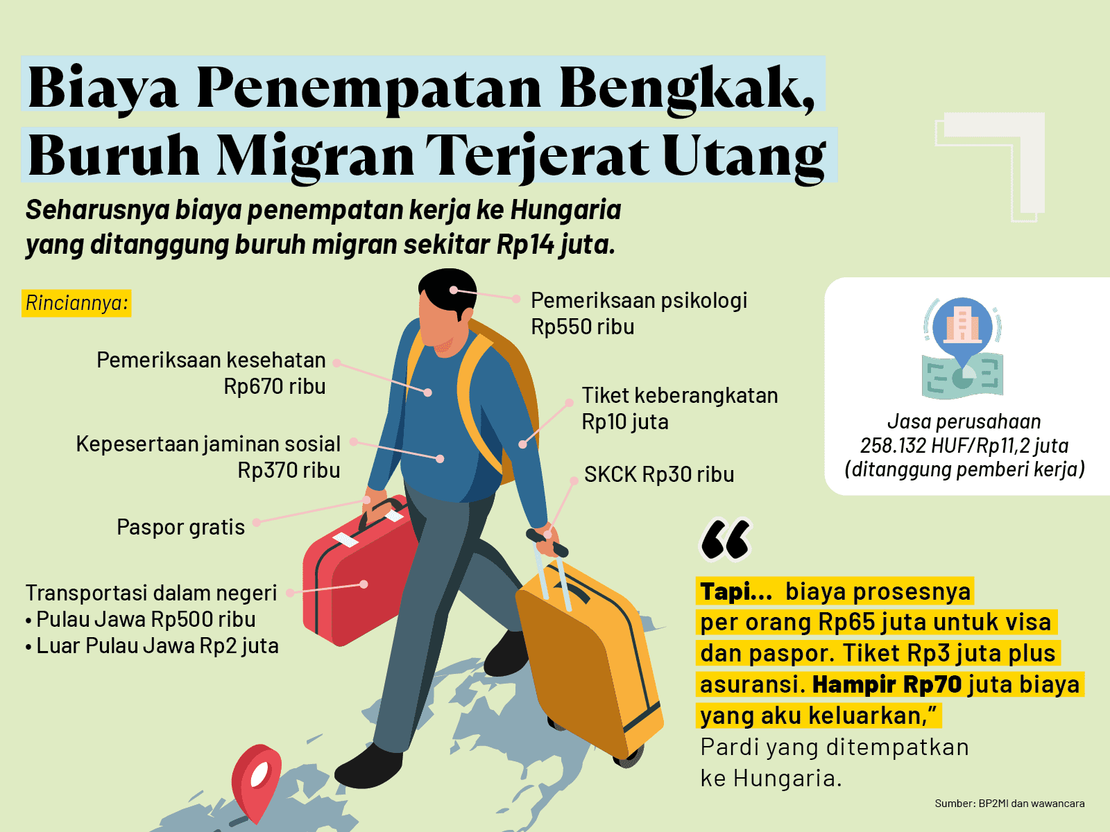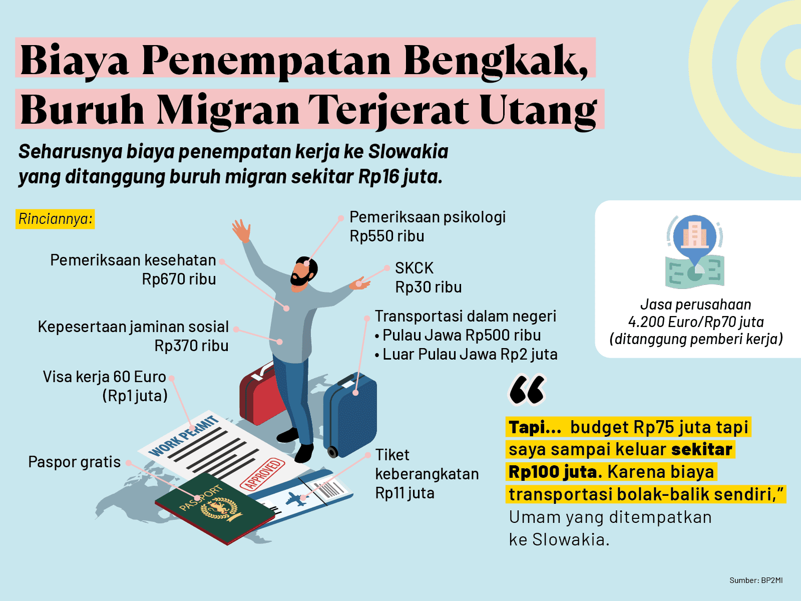 Untuk bekerja di Hungaria dan Slowakia tidak gratis. Pekerja migran Indonesia membayar biaya penempatan hingga puluhan juta ke perusahaan penyalur tenaga kerja. Bahkan mereka membayar lebih banyak daripada batas harga tertinggi yang ditetapkan pemerintah.