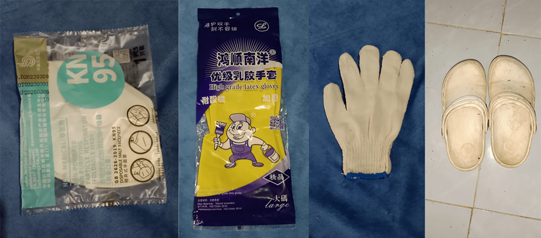 Beberapa Alat Pelindung Diri (APD) yang tidak memenuhi standar industri. Para buruh juga terpaksa membeli dengan uang sendiri karena jatah dari perusahaan tidak mencukupi kebutuhan setiap bulan. (Project M)