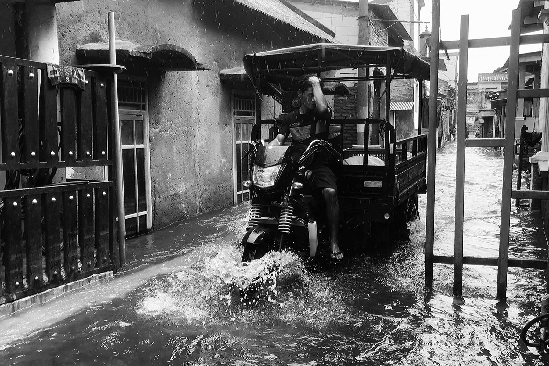 Saya menitipkan sepeda motor di depan masjid, lalu menggulung celana hingga di atas lutut, kemudian berjalan menghampiri Rokah, menerjang banjir rob yang sudah bercampur sampah dan berminyak yang seketika bikin kaki saya gatal-gatal. Sepanjang gang, tak ada siapa pun yang lewat.