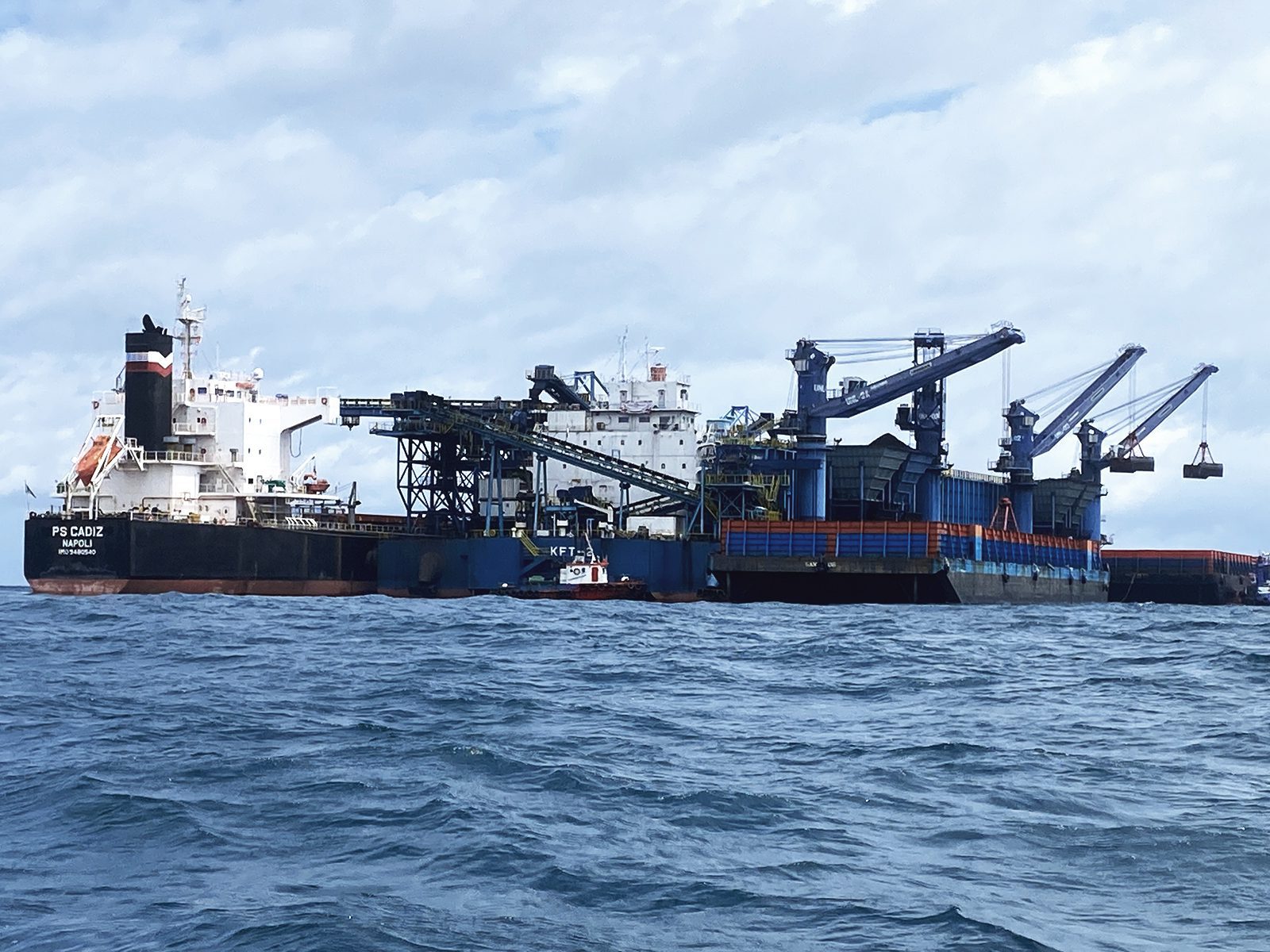 Moncong kapal nelayan yang kami tumpangi menghadap tongkang batu bara. Di situ sedang terjadi proses pemindahan batu bara dari tongkang ke kapal, ukuranya sekitar dua kali lebih besar–dalam praktik pertambangan, proses ini disebut transshipment batu bara. Di salah satu kapal itu tertulis KFT-1 berkelir putih, sementara salah satu tongkang dengan muatan batu bara menggunung di sekitarnya.