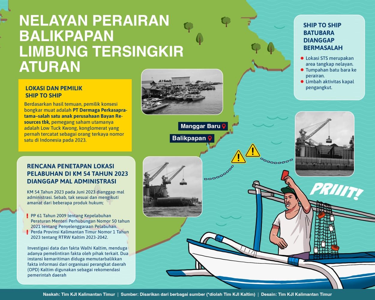 Di samping aktivitas bongkar muat yang merugikan nelayan, Walhi Kaltim menemukan adanya masalah dalam pola penggunaan ruang di perairan Balikpapan. Iqin mengatakan, untuk dasar penetapan lokasi pelabuhan–seperti halnya bongkar muat atau ship to ship batu bara–ketentuannya diatur dalam Peraturan Pemerintah Nomor 61 Tahun 2009 tentang Kepelabuhan. Dalam aturan itu, pasal 17 ayat 1 menyebutkan bahwa penggunaan wilayah daratan dan perairan tertentu sebagai lokasi pelabuhan ditetapkan oleh menteri sesuai dengan Rencana Induk Pelabuhan Nasional.