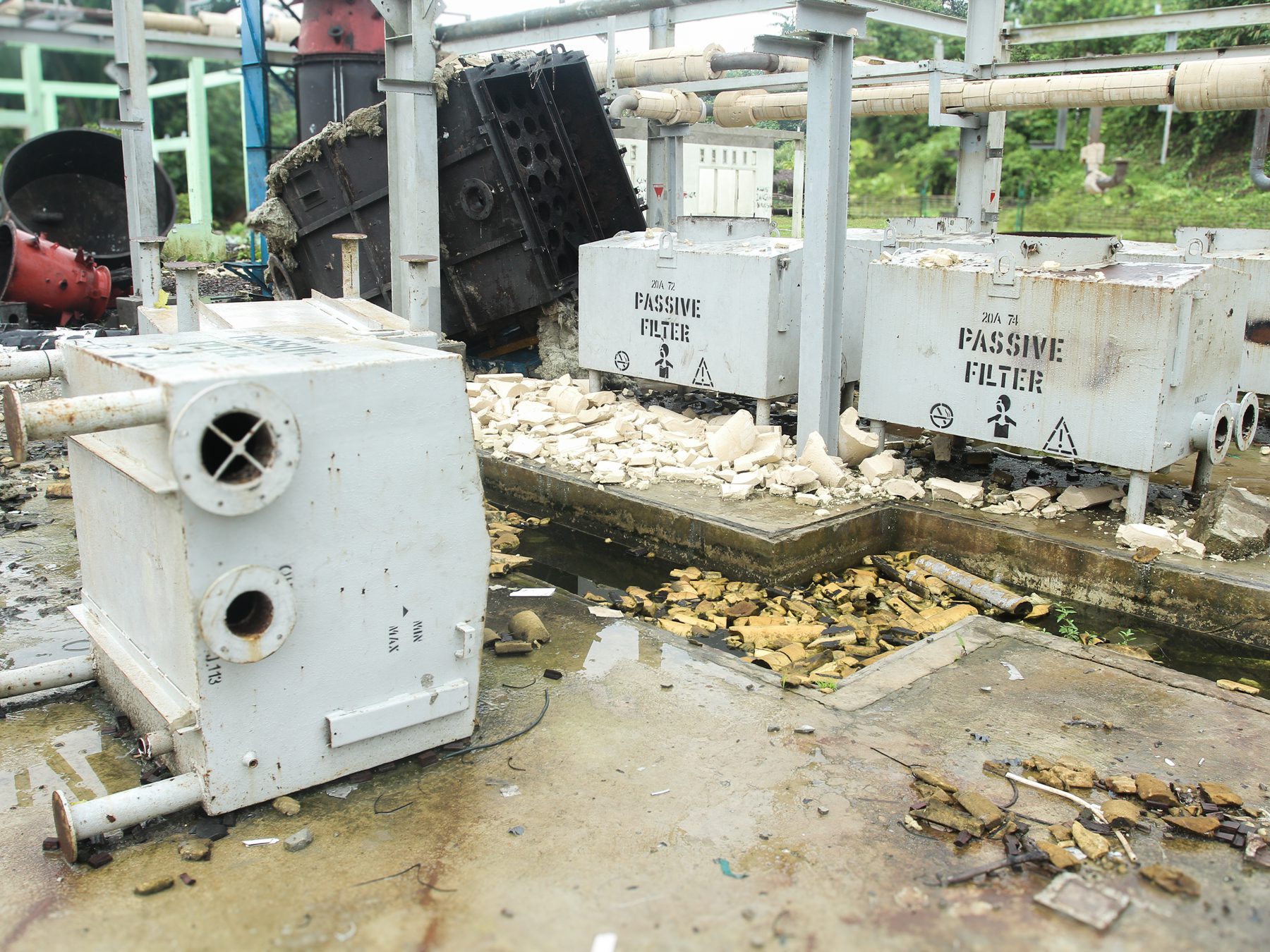 Keadaan Unit PLTBm Saliguma berkapasitas 250kW. Atap bangunan sudah hilang, komponen mesin banyak dicuri. Cuma tersisa konstruksi baja ringan. Sisa bahan baku seperti cincangan bambu dan kayu melembab dan lapuk. (Project M/Yose Hendra)