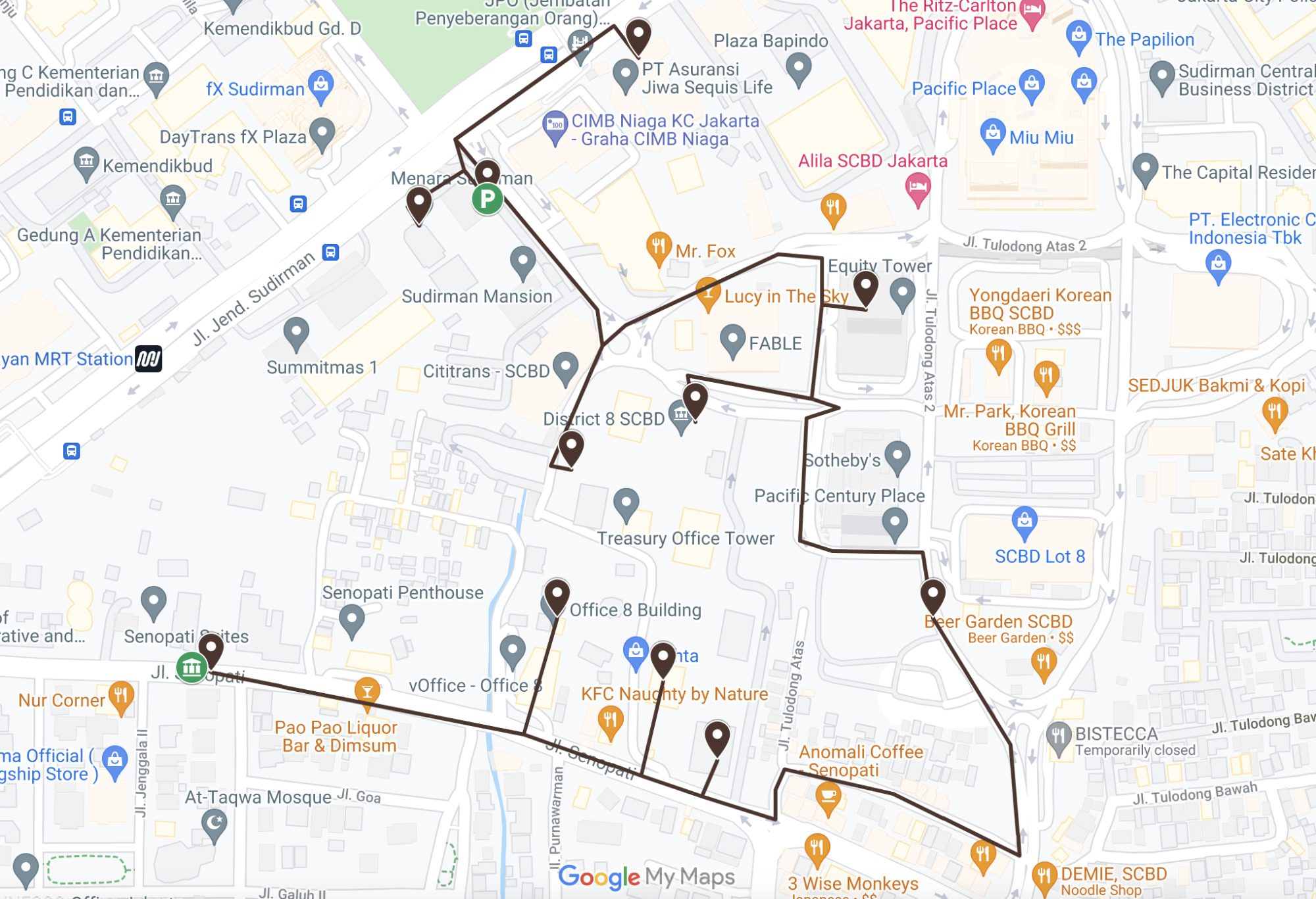 Di tangan saya masih ada 12 paket lagi untuk diantar ke Senopati. Lagi-lagi saya berpikir, tanggung sekali kalau harus jalan kaki kembali ke Plaza Asia untuk mengambil sepeda motor, lalu baru berangkat ke Senopati. Kalau melihat Google Maps, rasanya Senopati tidak terlampau jauh. Bisalah jalan sedikit ke sana.
