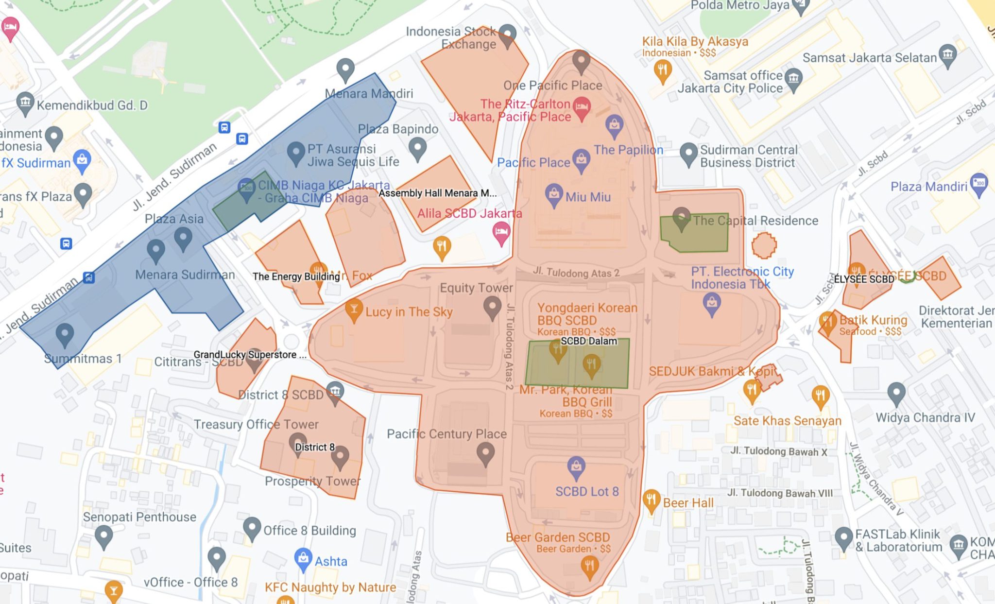 Sementara itu, sesuai namanya, “SCBD dalam” mencakup segala bangunan di bagian dalam kawasan bisnis ini, entah kompleks perkantoran District 8, Bursa Efek Indonesia, Mal Pacific Place, restoran dan bar Beer Garden, ataupun apartemen The Capital Residence.