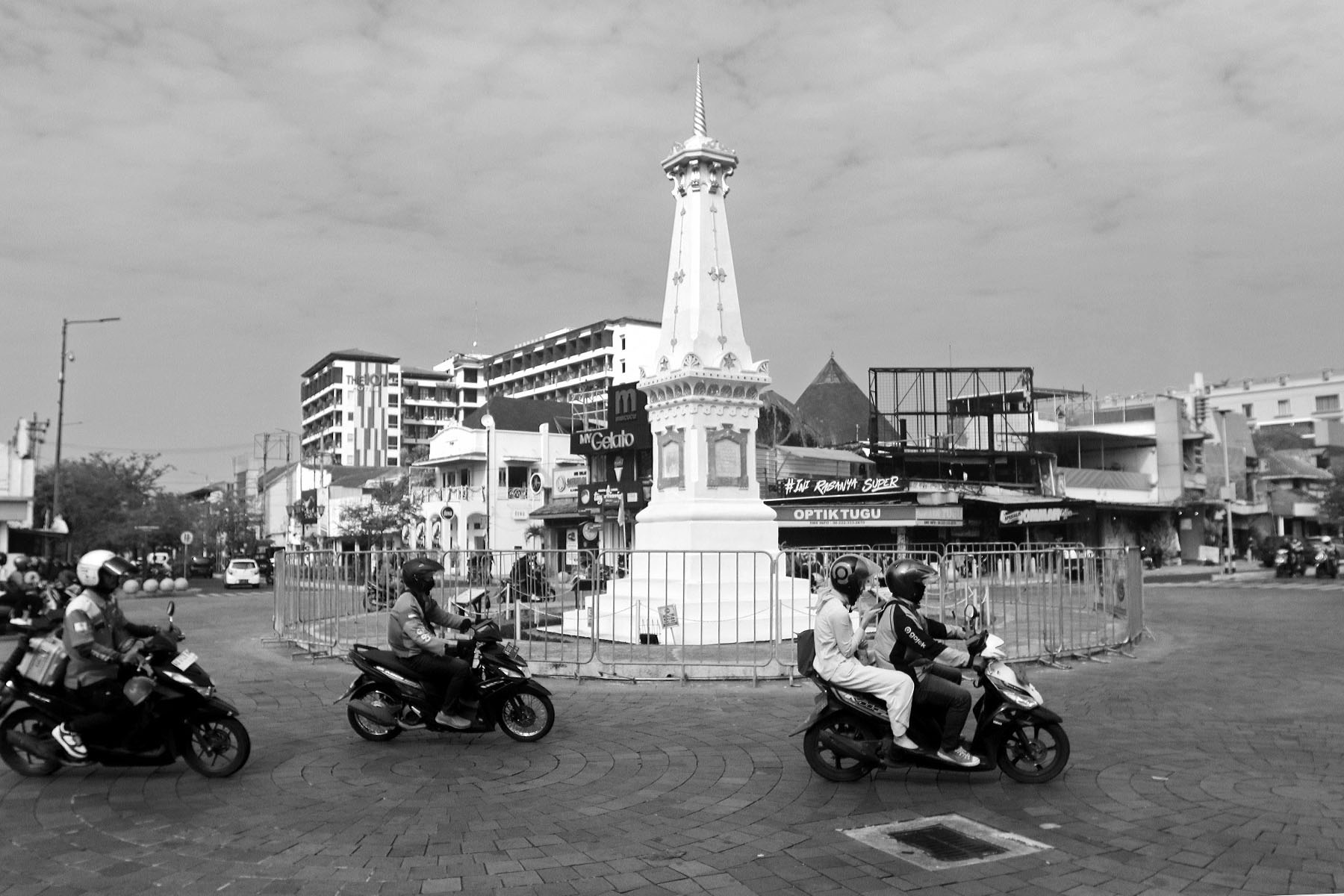 Tiga pengemudi ojek online melintas di kawasan Tugu, Yogyakarta.(Project M/Dhoni Setiawan)