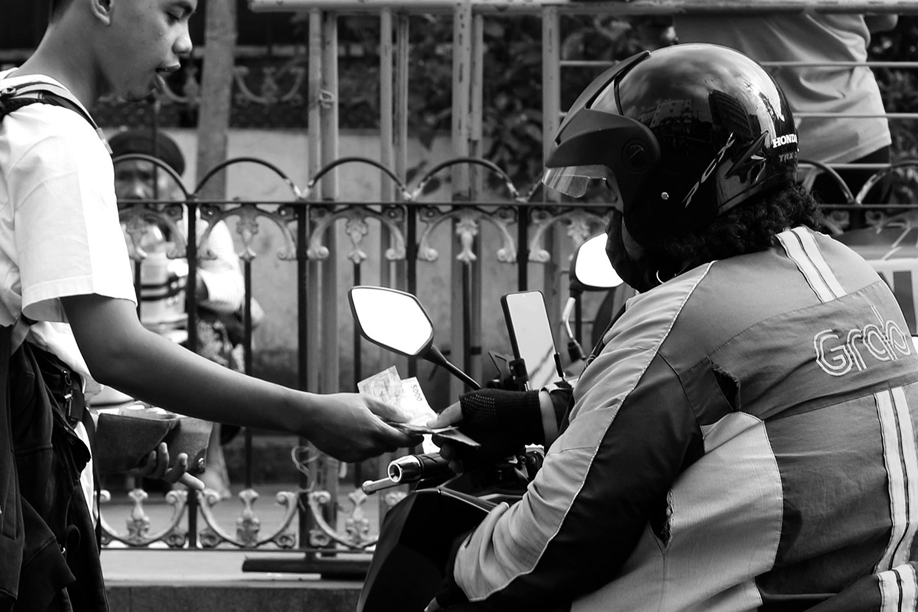 Seorang pengemudi ojek online menerima pembayaran tunai dari penumpang di kawasan Stasiun Tugu, Yogyakarta. (Project M/Dhoni Setiawan)