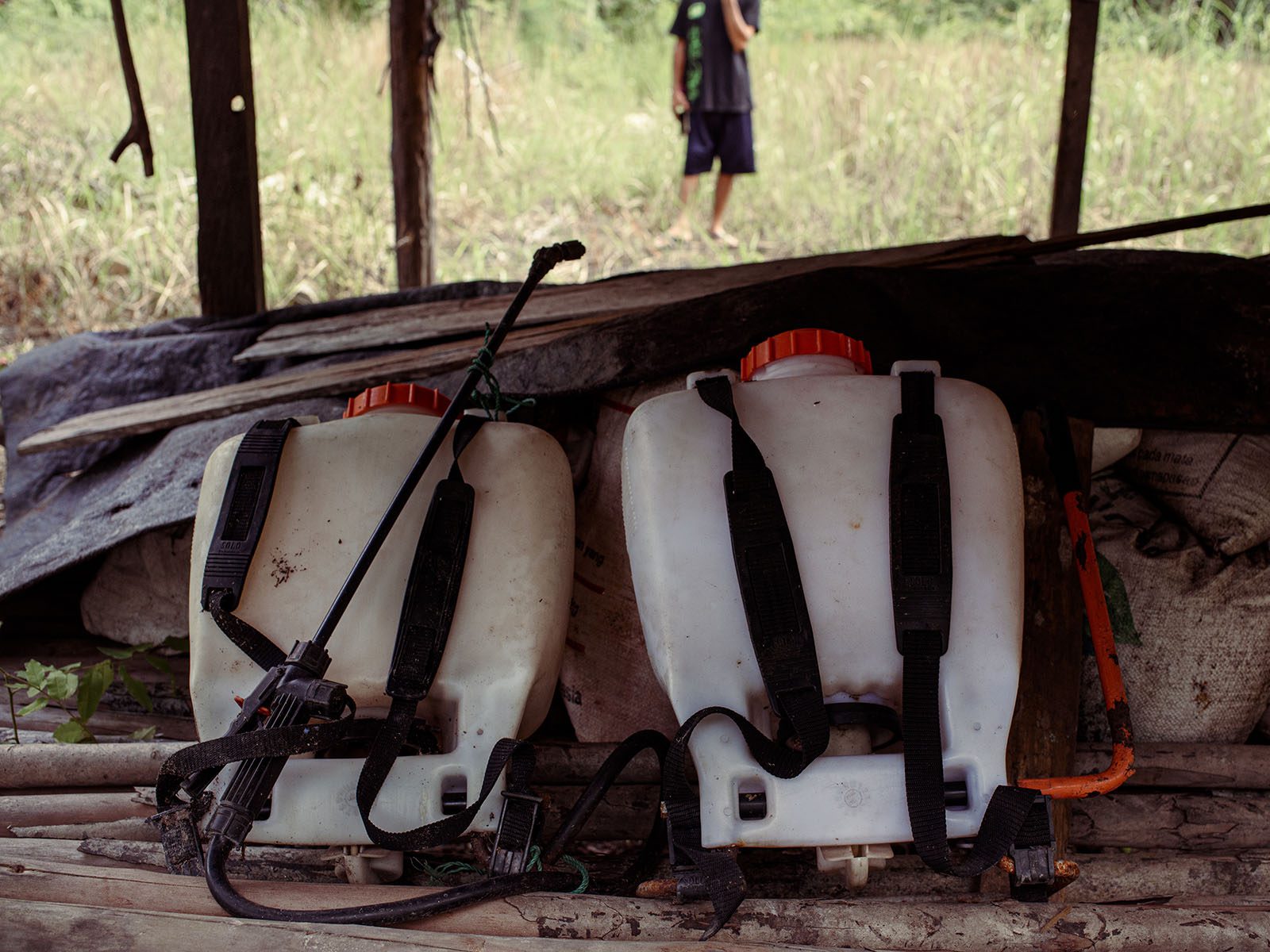 “Gramoxone itu keras soalnya,” kata Hesti. “Pusing dan mual itu sudah pasti. Kalau kena kulit itu, kalau pas saya menyemprot itu, rasanya gatal, lalu bengkak. Kadang pas mau menuangkan racun itu kena di tangan. Kalau sudah kena tangan harus dicuci bersih. Biasanya saya diamkan saja habis itu.”