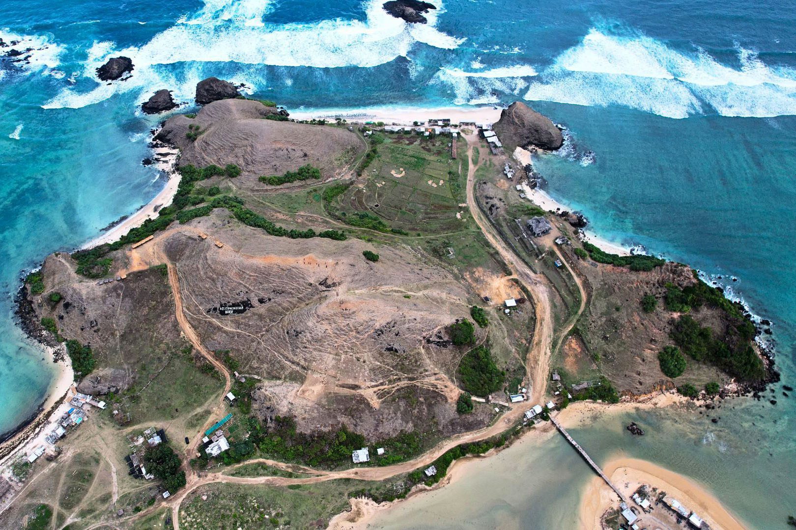 Foto udara Bukit Seger, salah satu pantai primadona Lombok Tengah yang ramai dikunjungi wisatawan setiap tahun saat tradisi Bau Nyale, sebuah tradisi mencari cacing laut yang dilakukan turun temurun demi menghormati Putri Mandalika. (Project M/Adi Renaldi)