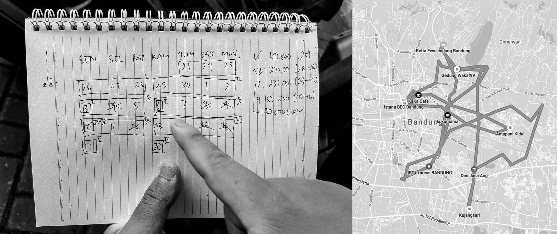 Pemasukannya sebagai kurir memang tidak konsisten dan sebesar pekerjaan sebelumnya. Anzhar belum ada pilihan lain. Istrinya mendapat upah Rp2 juta per bulan. Dengan penghasilan sebagai kurir, Anzhar mengaku khawatir tidak mampu membiayai kebutuhan keluarganya.Click To TweetSaya lantas memperlihatkan rekaman perjalanan bersamanya di Google Maps. Linimasa di aplikasi itu menunjukkan sejak berangkat dari kantor istrinya, Anzhar sudah ‘mengelilingi’ Bandung sejauh 61,7 kilometer hingga ke tempat saya memarkirkan motor. Perjalanan itu menghabiskan waktu 4 jam 35 menit.