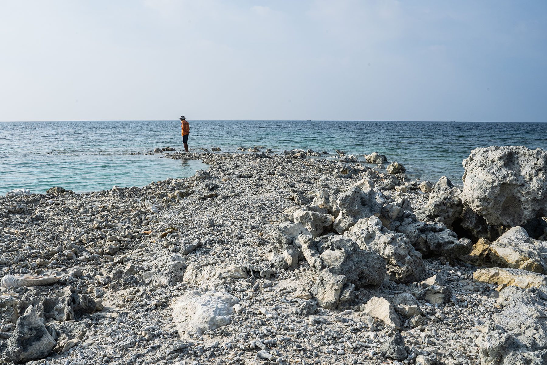 Saya harus mendaki sekira dua meter untuk mencapai permukaan gundukan. Di ujung timbunan pasir, seorang nelayan mengambil batu-batu karang besar yang ditimbun di dalam kapal kecilnya.