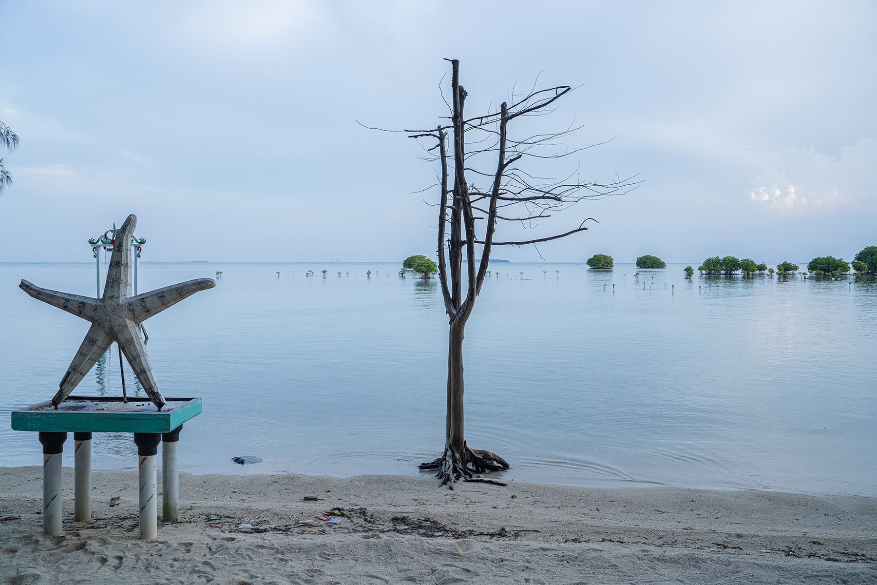 Saat matahari pelan-pelan terbenam di ufuk, Arif menemani saya berkeliling, menunjukkan beberapa perubahan yang terjadi di sepanjang bibir pantai yang semakin tergerus air laut. Dia menunjukkan sebatang pohon ketapang yang mati tetapi masih berdiri tegak tepat di bibir pantai dengan akar digenangi air laut.