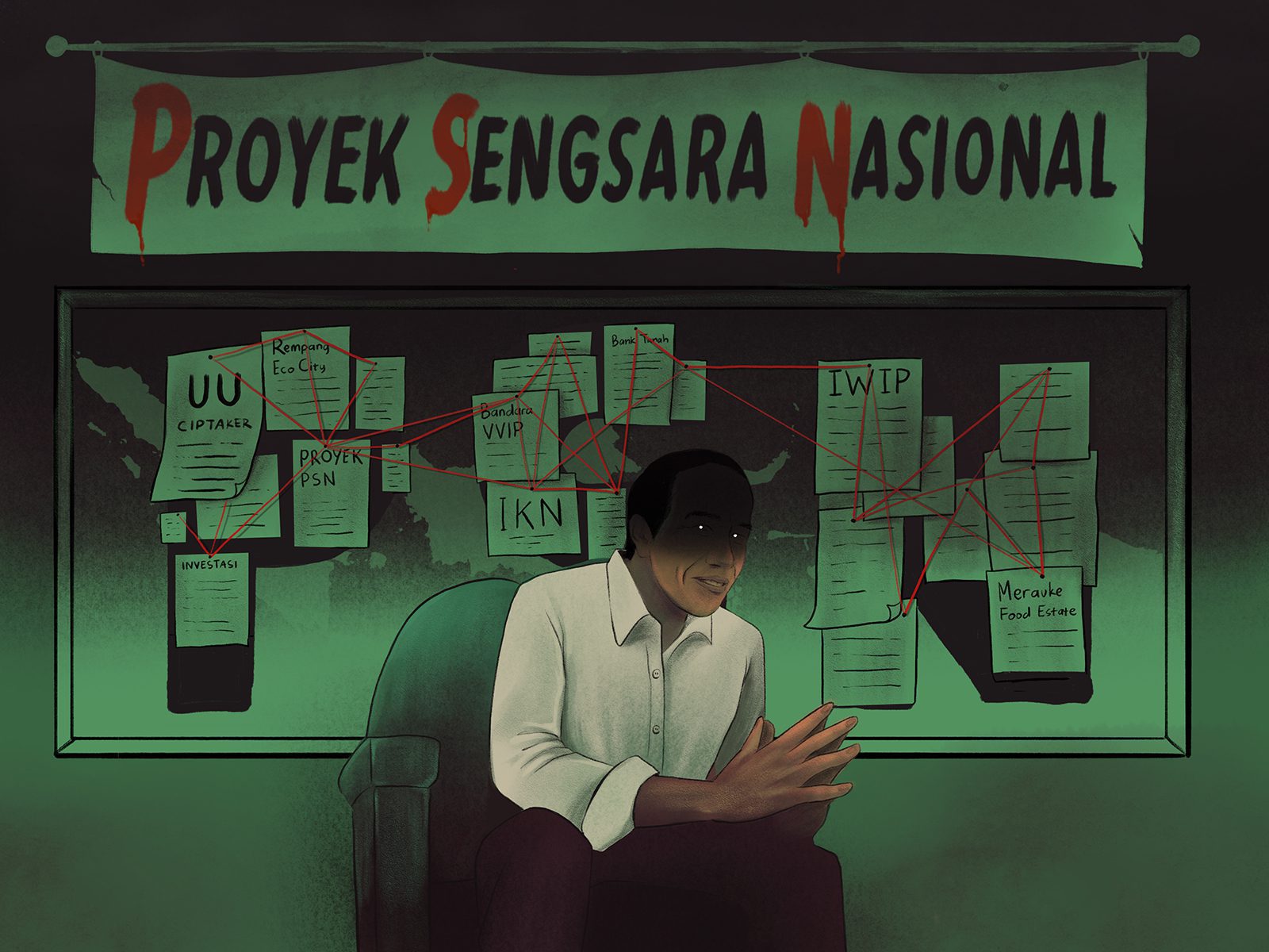 Meminjam satire yang disematkan publik atas proyek strategis nasional (PSN), serial ini menyoroti berbagai penyimpangan dan konflik tenurial, marjinalisasi, pengerahan aparat keamanan, dan sentralisasi kebijakan. Sejak ditetapkan Presiden Jokowi pada 2016, lebih dari 200-an PSN di seluruh Indonesia telah membuat kehancuran metabolik alam-manusia dan degradasi ruang hidup gila-gilaan. (Ilustrasi oleh Mohammad Ikbal)